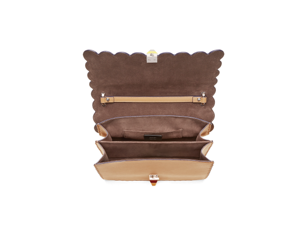 芬迪Fendi KAN I手袋中号 黄色小牛皮手袋,独特的撞色上色波形边缘,设有由硬隔板分隔的接裆式内部。配以可滑动链式长肩带,缀有皮革嵌片,可斜背或手拿。设有金属圆环,可挂上手袋挂饰,为手袋添上个人风格。转锁开合,装饰双重双色有机玻璃铆钉。镀钯饰面金属配饰。