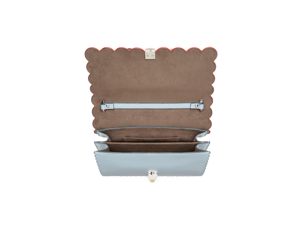芬迪Fendi KAN I手袋中号 粉蓝色小牛皮手袋,缀以独特撞色上色波形边缘及多色皮革花朵和铆钉。内部设有由硬隔板分隔的接裆式隔层。配以可滑动链式长肩带,缀有皮革嵌片,可斜背或手拿。可配搭FENDI手袋挂饰,增添个人风格。转锁开合,装饰双重双色有机玻璃铆钉。镀钯饰面金属配饰。