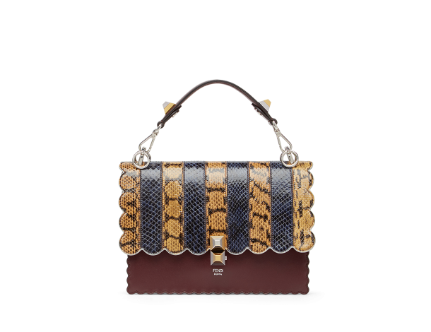 芬迪Fendi KAN I手袋中号 酒红色小牛皮手袋,独特的撞色上色波形边缘,鸢尾蓝色和芥末黄色双色锦蛇皮翻盖。内部设有由硬隔板分隔的接裆式隔层。配以可滑动链式长肩带,缀有皮革嵌片,可斜背或手拿。可配搭FENDI手袋挂饰,增添个人风格。转锁开合,装饰双重双色有机玻璃铆钉。镀钯饰面金属配饰。