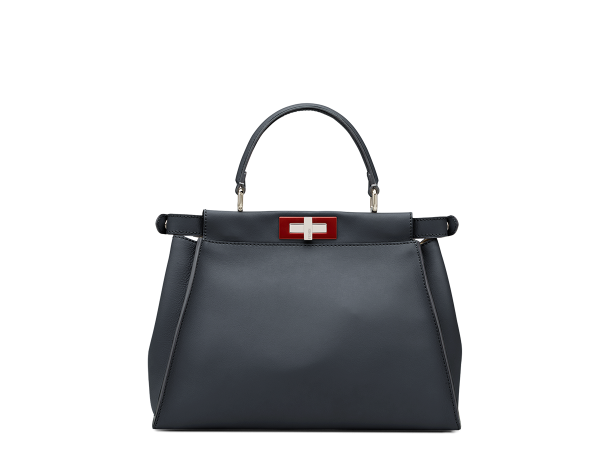 芬迪Fendi包包 PEEKABOO REGULAR 午夜蓝色小牛皮手袋,通过板岩灰色硬隔板分隔出两个夹层。红色电镀索环和装饰条,镀钯扭锁和金属配件。单提手和可调节可拆卸肩带。内侧拉链口袋。