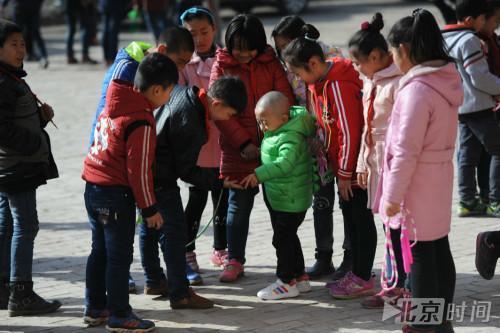 由于小晗煜不能弯腰,大小便都需要妈妈的帮助,为此泥屯小学特意开辟绿色通道同意妈妈陪读。在教室外的最近的一颗树下,小晗煜在妈妈的帮助下正在小便。泥屯小学的薛校长说:“厕所距离教室有近百米的距离,孩子的情况特殊,我们也得人性化处理,他也是我们学校唯一能在树下小便的学生。”在小晗煜住院期间,全校还为他发起过捐助活动。