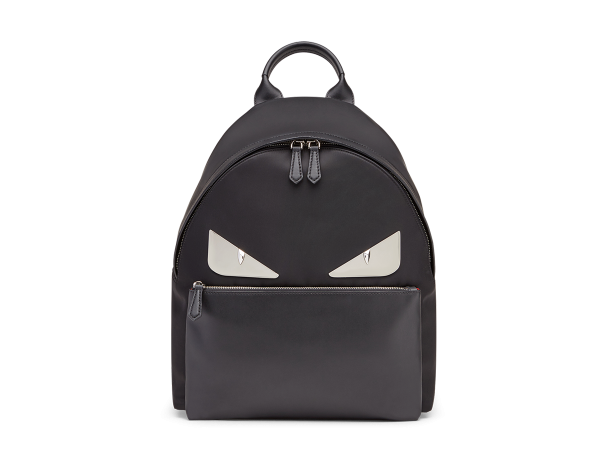 黑色尼龙男士背包,以白色皮革和金属亮片呈现BAG BUGS眼睛镶饰造型。正面拉链口袋,侧面和提手同色系皮革。背面采用透气科技网布材料。双拉链门襟和内袋。