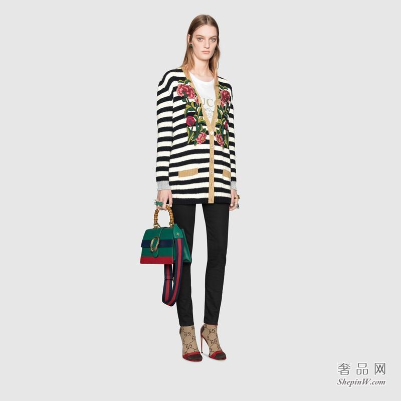 具有结构感的撞色Dionysus手袋,采用真皮打造,配以织纹虎头马刺扣 — 此独特细节灵感来源于希腊神狄俄尼索斯(Dionysus),神话中,他曾骑在宙斯(Zeus)派来的老虎身上,越过底格里斯河(Tigris)。采用优质粒面皮革精制而成,其以光泽和柔软著称。