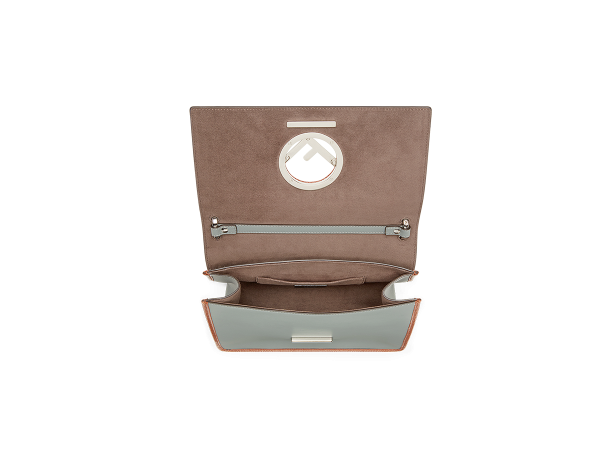 KAN I手袋,饰以最新Fendi F LOGO。磁扣开合。内部接裆设计,设有一个口袋。配以可拆卸肩带,可斜背或手拿。亮深蓝色鳄鱼皮和海草色小牛皮制作。缀以撞色卡隆淡水蛇皮和品牌标志。镀钯饰面金属配饰。