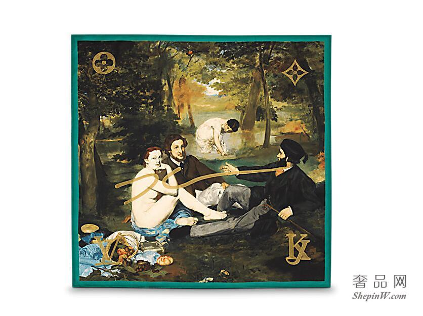 著名的路易威登真丝方巾也成为此跨界合作设计与顶级卓越工艺结合的另一创作。在真丝斜纹绸上重现大师杰作,再以精美细致的金线刺绣,展现绝美气息。
