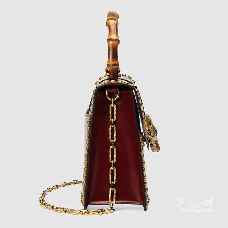 Gucci 亮泽真皮织锦手提包 款式 466434 DT9KX 6373 此款饰钉手提包采用象征机智的狐狸印花装饰,这一图案是Gucci 2017春夏季的全新标志。标志性的竹节提手与珠宝风格链式肩带形成精致对比,并配以眼镜蛇印花蛇皮细节。采用光滑亮泽的皮革精心打造,表面结实,造型颇具结构感。