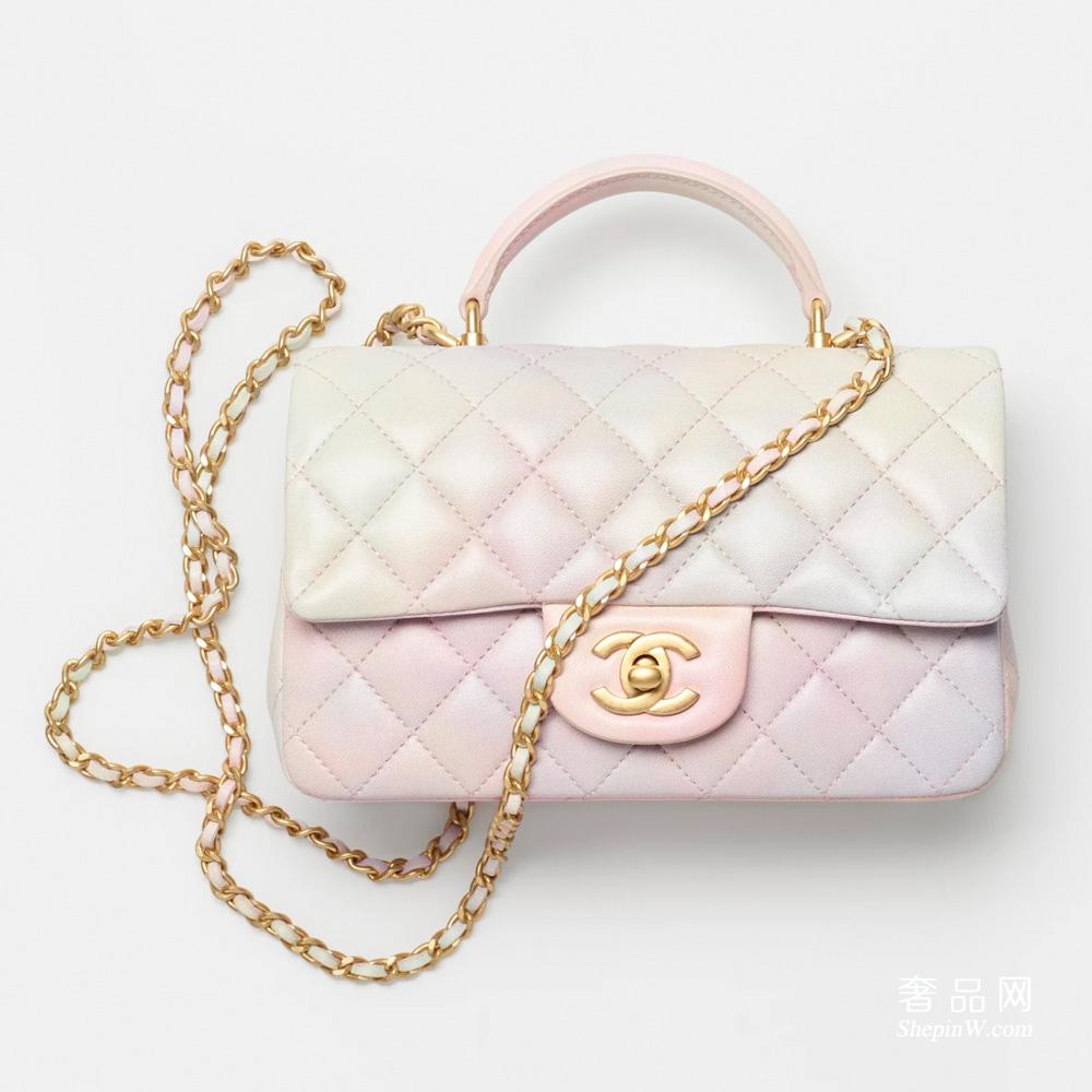 香奈儿官网2022新款包 CHANEL 迷你口盖包配以手柄 羊皮革与金色金属 澹粉红与澹绿