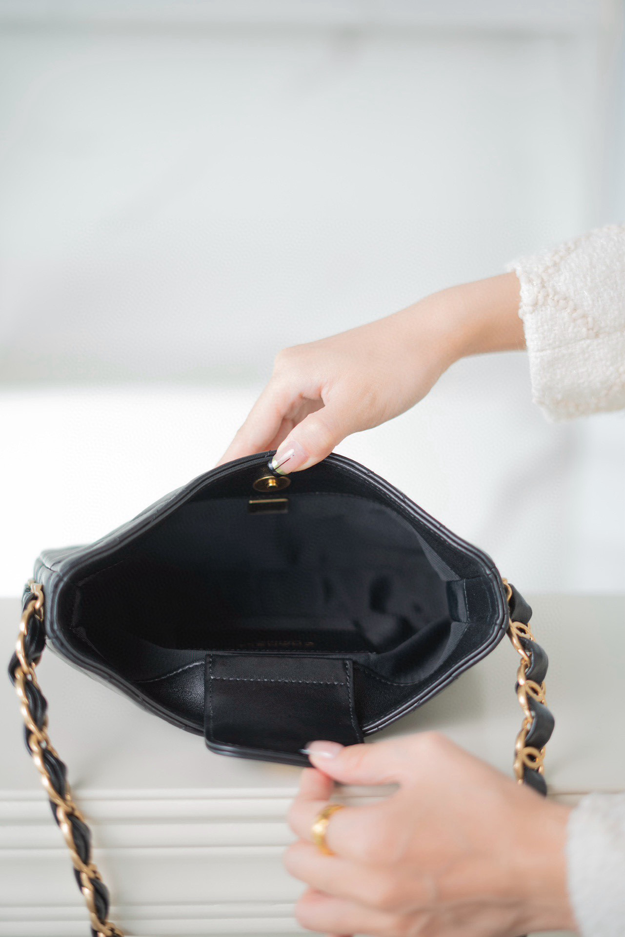 CHANEL包包香港官网专卖店价格表 24K粗链条HOBO腋下包 黑色 皮面为小羊皮材质,手感细嫩柔软,肉感十足,皮面通透且呈现柔雾的光泽!复古时髦,无需费力搭配,轻轻松松就能营造出随性松驰感 尺寸:17*24*5cm