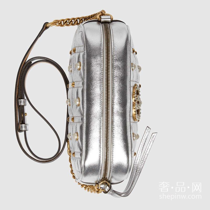 Gucci GG Marmont绗缝肩背包 款式 447632 DMKJT 8179 小号GG Marmont链条肩背包采用颇具结构化的柔软造型,顶部拉链扣配以双G金属配件,装饰珍珠。链式肩带带有真皮护肩细节。采用绗缝真皮精心打造,装饰立方体图案,更配有金属和珍珠铆钉。