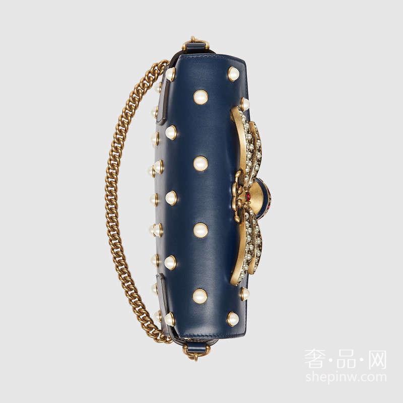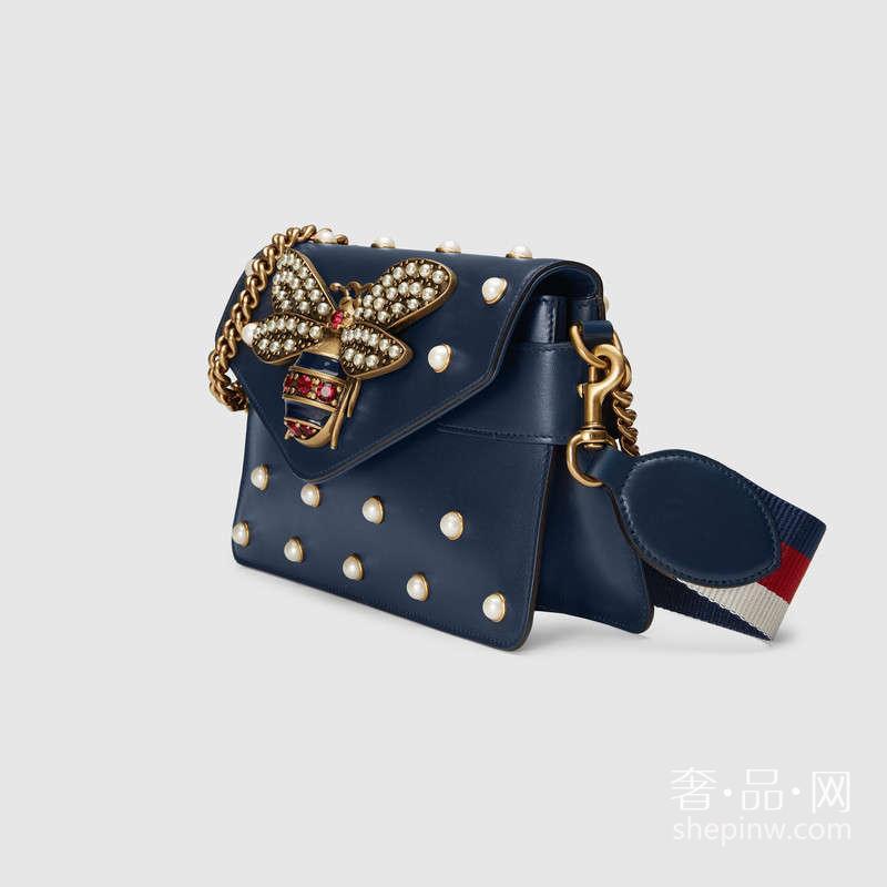 迷你手袋,装饰珍珠铆钉和金属蜜蜂细节。蜜蜂身体条纹部分采用蓝色珐琅和红色水晶宝石突出装饰,翅膀部分配以珍珠效果铆钉。